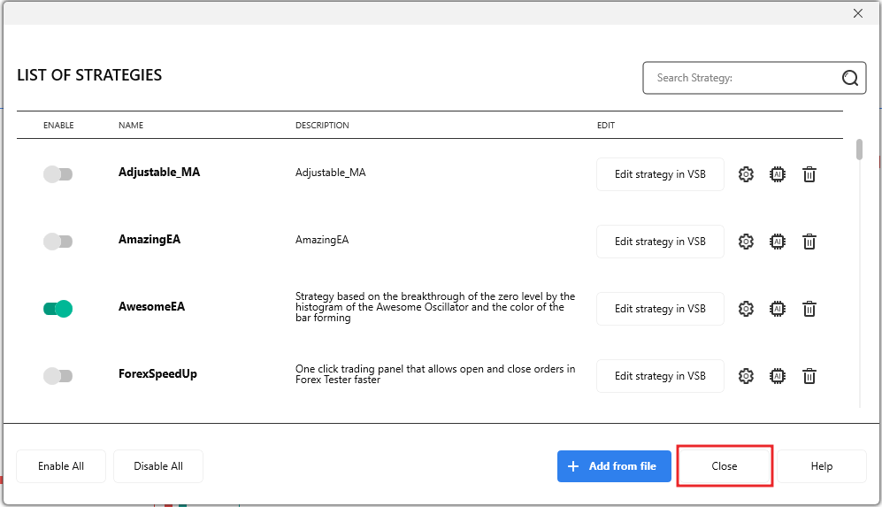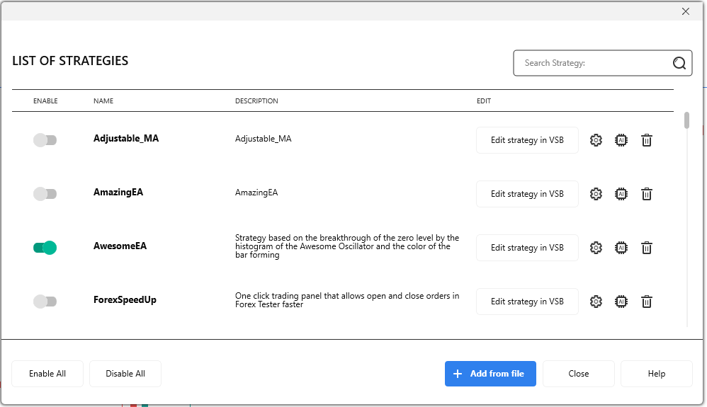 To backtest the EAs already included in Forex Tester, click the “List of strategies” button on the Strategies tab.