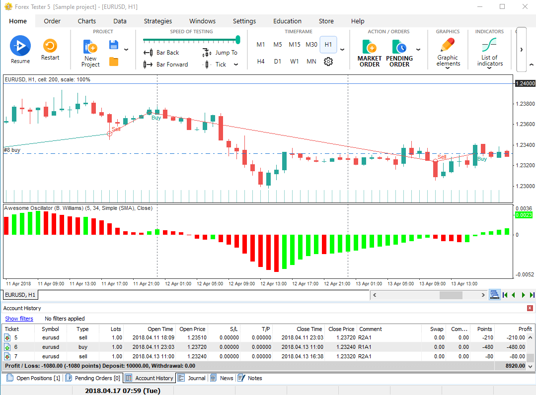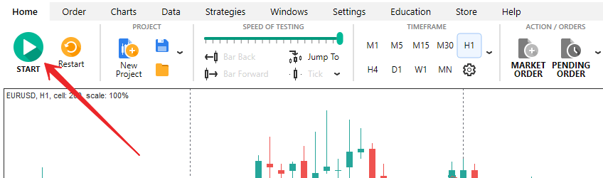 Forex Tester will automatically open and close orders due to the strategy rules programmed in the Expert Adviser.