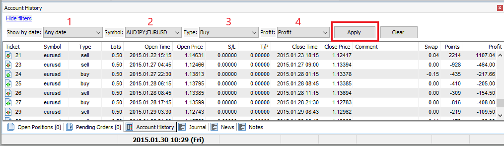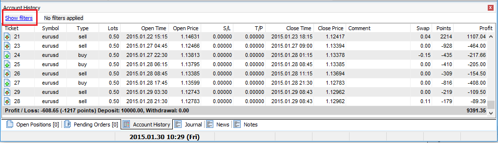 Use different filters to make your trading analysis more convenient by clicking the Show filters link.