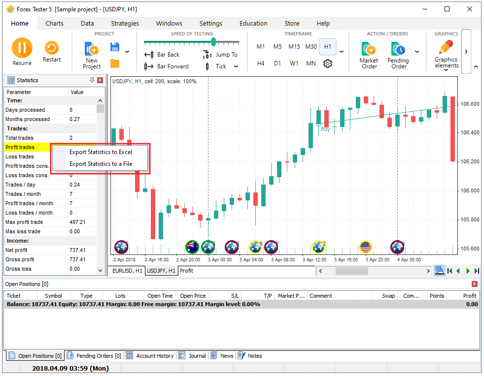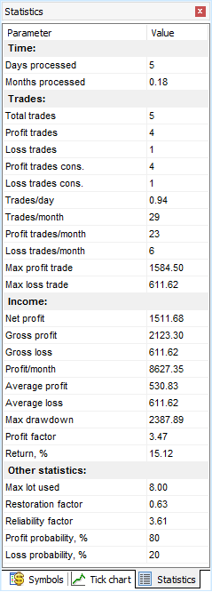 The statistics on the strategy’s performance are displayed during the test and after the testing is finished. The Statistics window shows the most important indicators such as:
