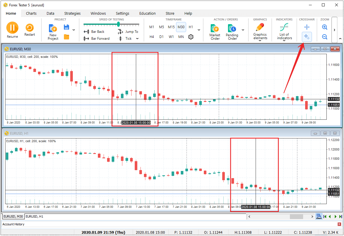 The crosshair mouse pointer is represented on all charts with all timeframe differences kept.