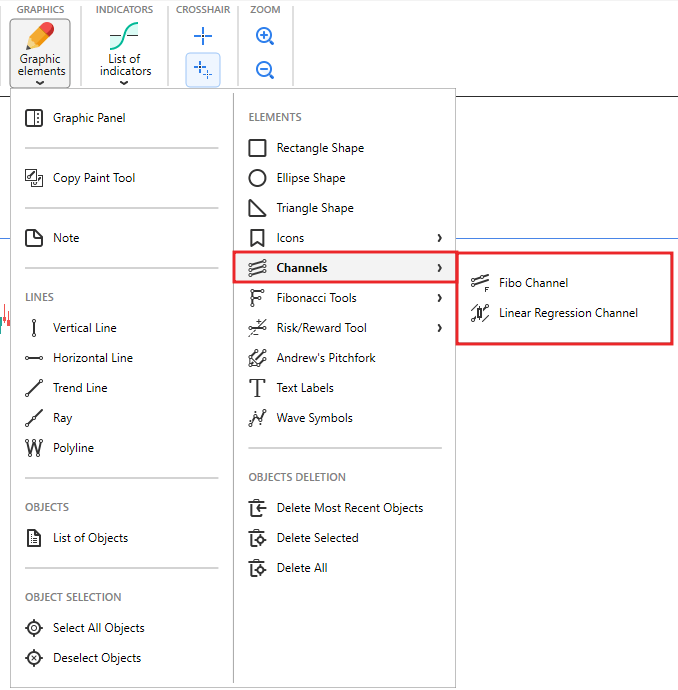 In the Channels group, you will find the Fibonacci Channel tool and the Linear Regression Channel.