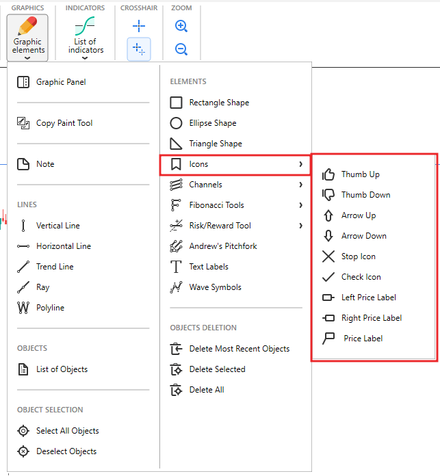 You can also view all tools currently added to a selected chart and change or delete any of them using the “List of objects” button.