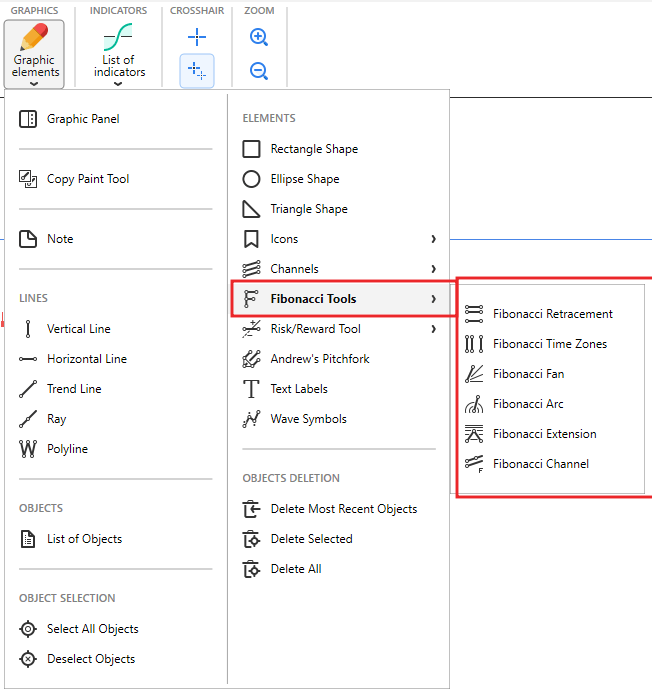 The Fibonacci tools group consists of 5 instruments for chart analysis: