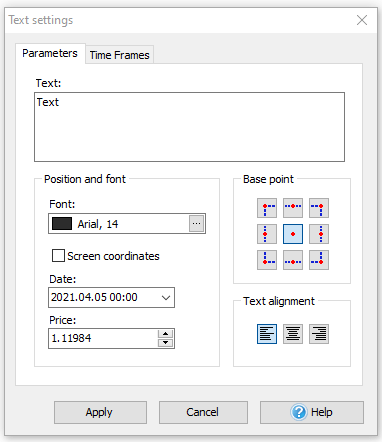 Here you can write any text, which will be shown on the chart (in the Text: field), and also change the format of text (font type and size, color of the text, base point, and text alignment). Click the “Apply” button to finish the text adding.