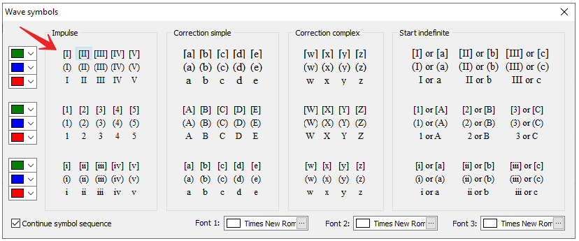 For example, if you select the first symbol in a table and then left-click on a chart, the [I] symbol will be placed. If you left-click one more time, the [II] symbol will be placed on the chart. And so on.