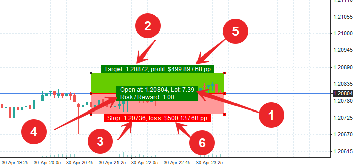 Please note that you can move, resize, change properties and SL/TP levels of the tool after applying to the chart anytime you need to. In this case, all the values will be recalculated automatically.